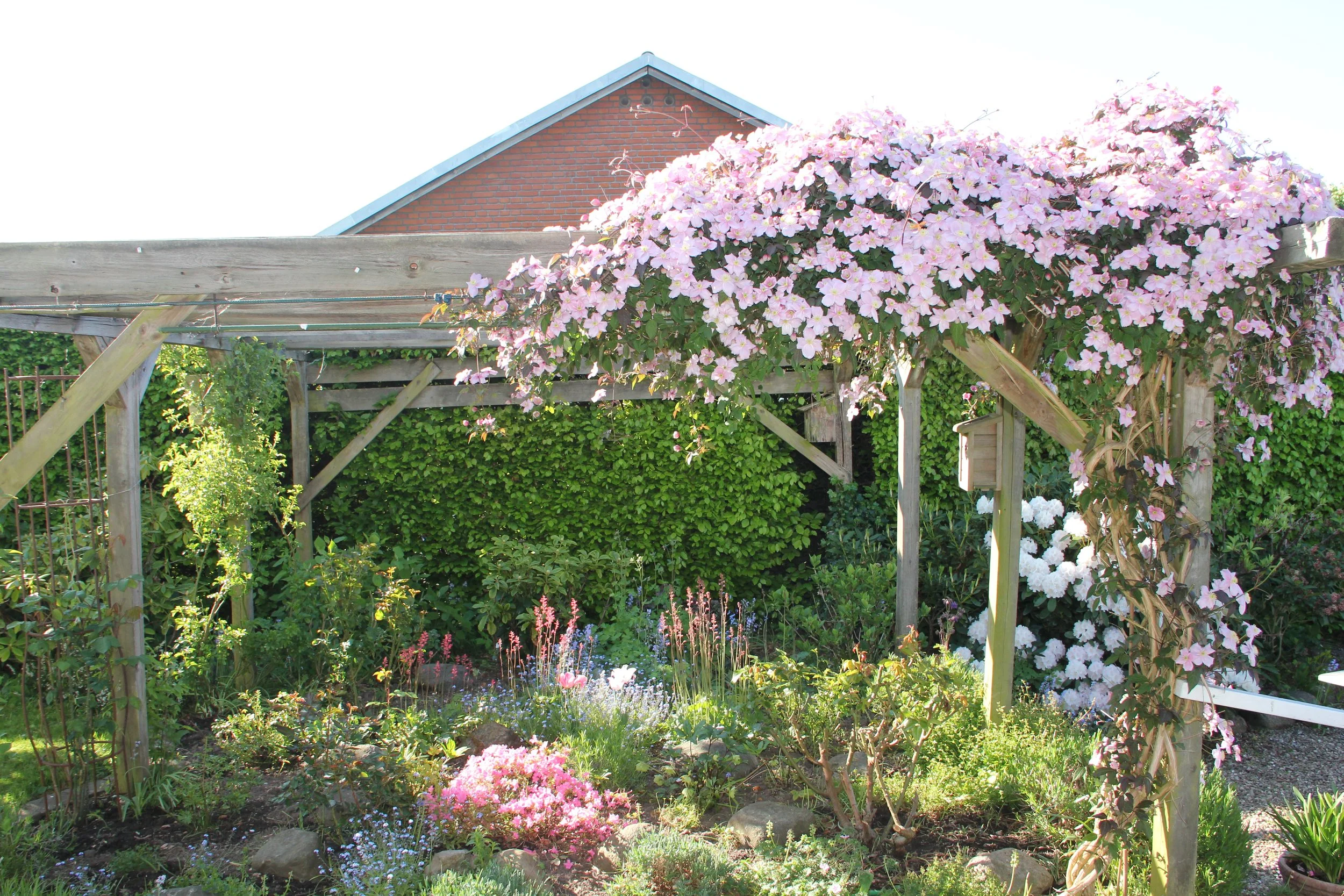 Denne skønne have på 1200 m² er et grønt paradis fyldt med frugttræer, bærbuske, krydderurter, spiselige blomster og sæsonens udplantningsplanter som kål og gulerødder.